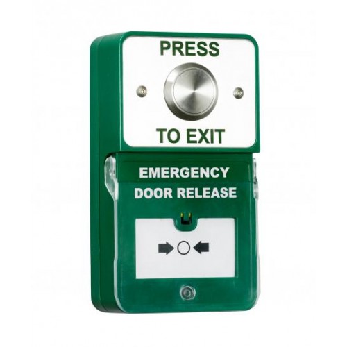 Dual Unit- Press to exit - stainless steel plate and button and combined Emergency release button (resettable) surface mounted, includes back box with security screws. Buzzer and LED indication with three voltage free contacts.