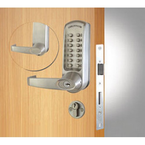 The outside lever handle will retract the latch after a correct code is entered. The spring loaded latchbolt will lock automatically when the door is closed. The key retracts the latchbolt for entry without using a code. The key controls the deadbolt position. When the deadbolt is projected it denies access by code. When the deadbolt is projected the safety feature allows the inside lever handle to retract the deadbolt and the latchbolt, preventing people being accidentally lock in. The key can be used to open the doors for management functions such as security and cleaning.