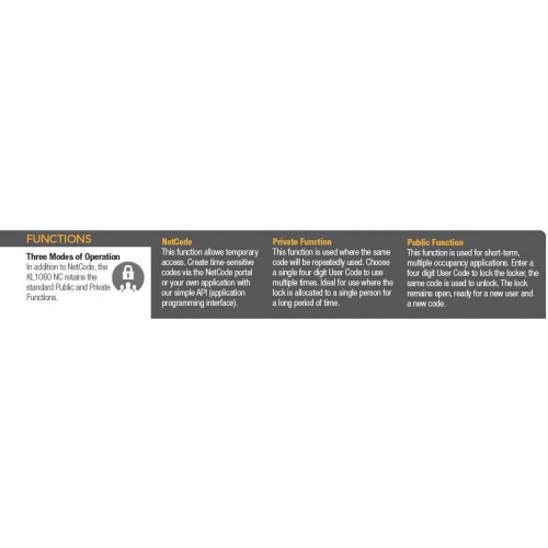 This function is used for short-term, multiple occupancy applications. Enter a four digit User Code to lock the locker, the same code is used to unlock. The lock remains open, ready for a new user and a new code.- Short-term multi-use codes with durations from 1 to 12 hours and 1 to 7 days