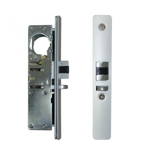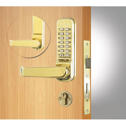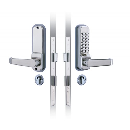 A medium duty mechanical mortice lock with double cylinder, 3 keys and anti-panic safety feature. The outside lever handle will retract the latch after a correct code is entered. The spring loaded latchbolt will lock automatically when the door is closed. The key retracts the latchbolt for entry without using a code. The key controls the deadbolt position. When the deadbolt is projected it denies access by code. When the deadbolt is projected the safety feature allows the inside lever handle to retract the deadbolt and the latchbolt, preventing people being accidentally locked in. The key can be used to open doors for management functions such as security and cleaning.